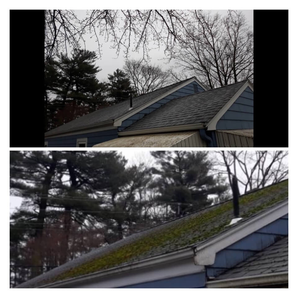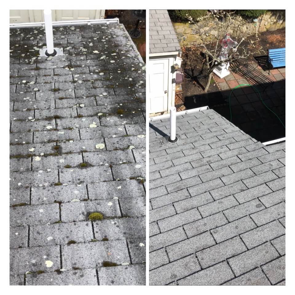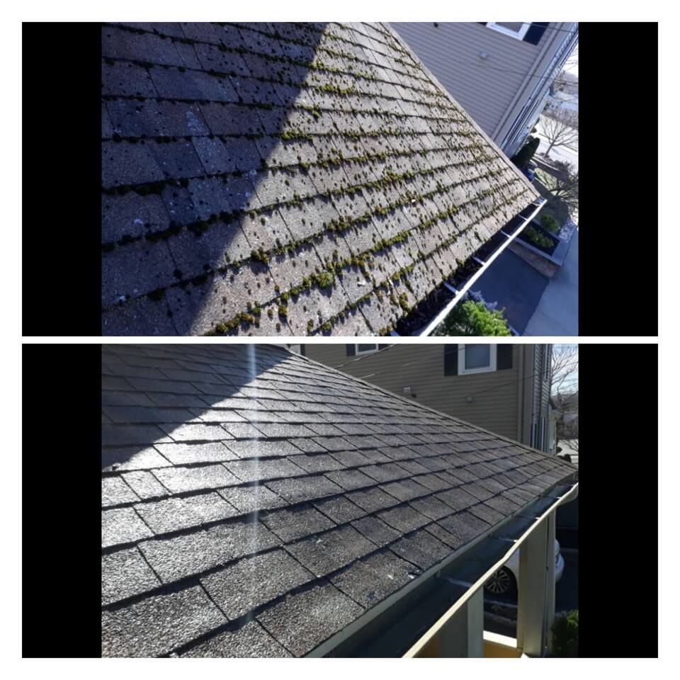 HiCleaners is the most experienced company in Boston, MA that deals with roof washing and roof soft washing. All of our employees are trained to recognize precise solution mixing ratios to provide you with the safest and most effective soft washing service. Roofs are a commonly neglected part of a house due to the fact that most people don’t have ladders to access it, so it is very easy to just leave it alone and forget about problems that may start to arise. Just like many home owners, discoloration and small bits of moss on a roof can be overlooked because of the misconception that it is just aesthetic. However, it isn’t just aesthetic, the moss slowly lifts the granules off the shingles which in turn shorten the life of the shingle. The moss also spreads, just like any bacteria if it is left alone for too long, it can quickly become a problem that spirals out of control. Call HiCleaners for a free quote, we only use the most advanced eco-friendly solutions and equipment to make sure the job is done right, for the safety of the employees, your plants, grass, pets, and children.